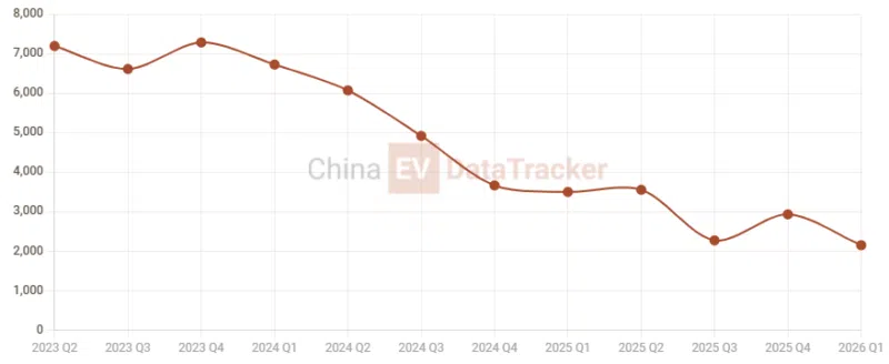 По данным China EV DataTrucker, продажи бренда Land Rover в Китае оставались под давлением в последние кварталы. В первом квартале 2026 года продажи достигли 2153 единиц, что на 38,5 процента ниже, по Сравнению с долей рынка в 0,1 процента. Более ранние ежеквартальные данные показывают устойчивое снижение по сравнению с уровнем 2023 года, когда объемы стабильно превышали 6000 единиц за квартал.